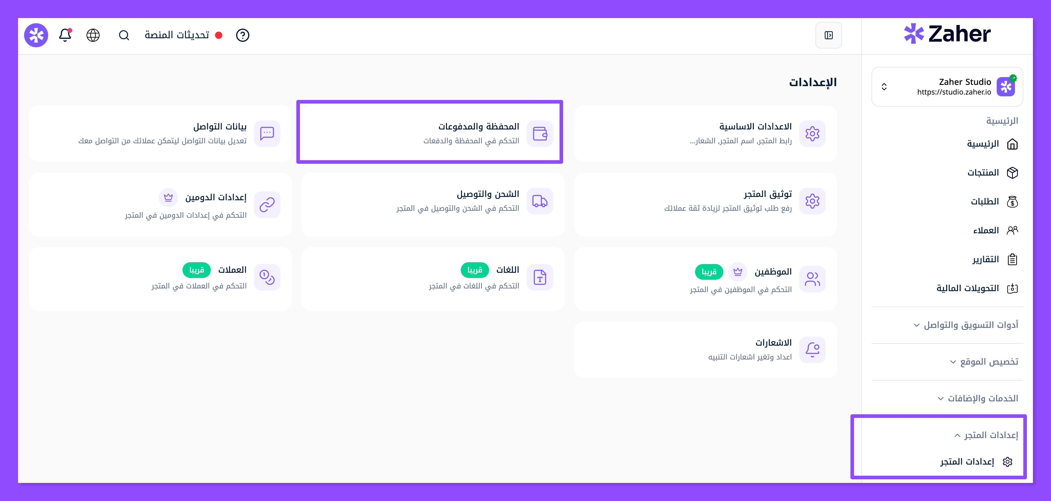 توجه إلى لوحة التحكم الخاصة بمتجرك، منها مباشرةً إلى قسم المحفظة والمدفوعات.