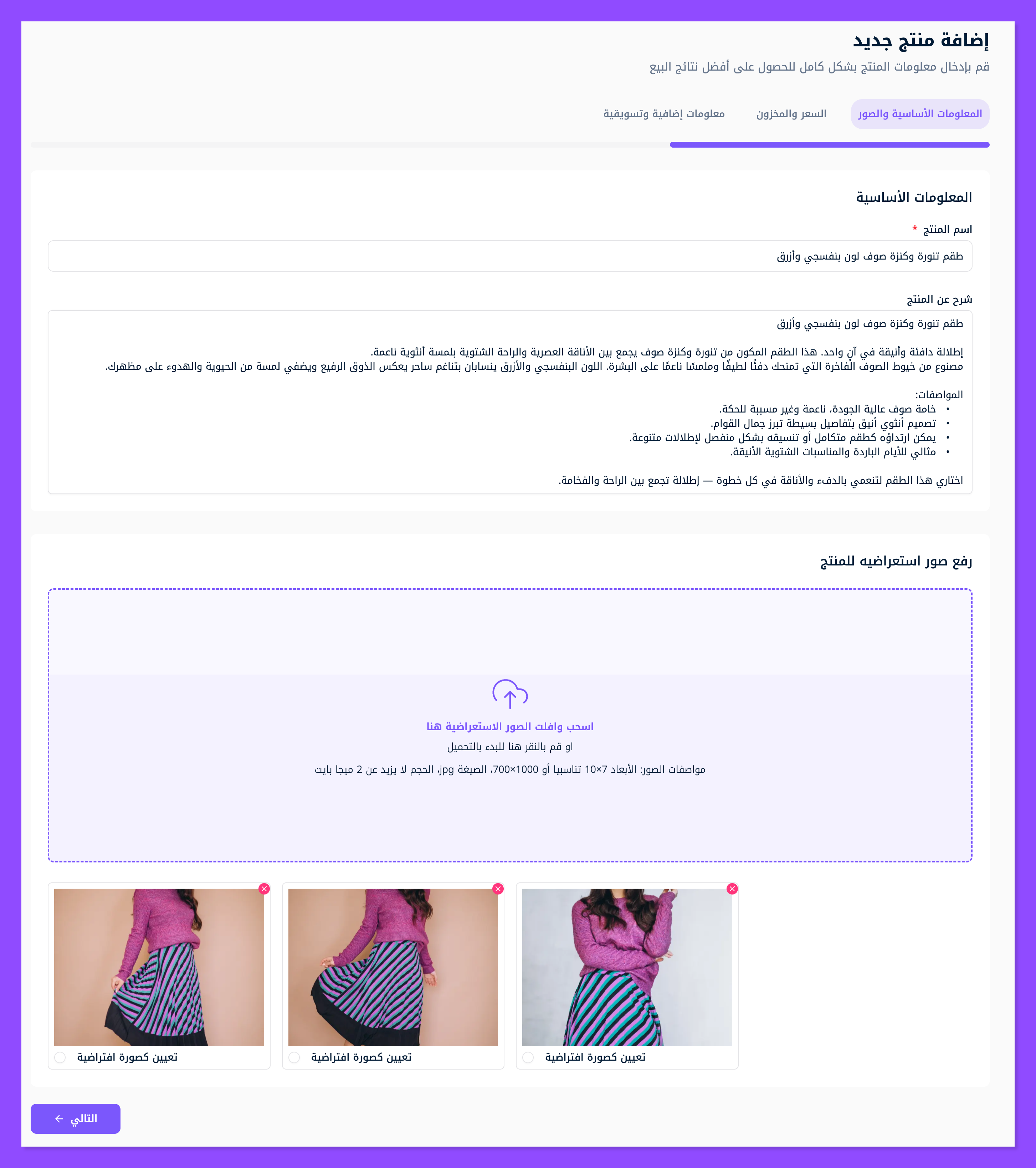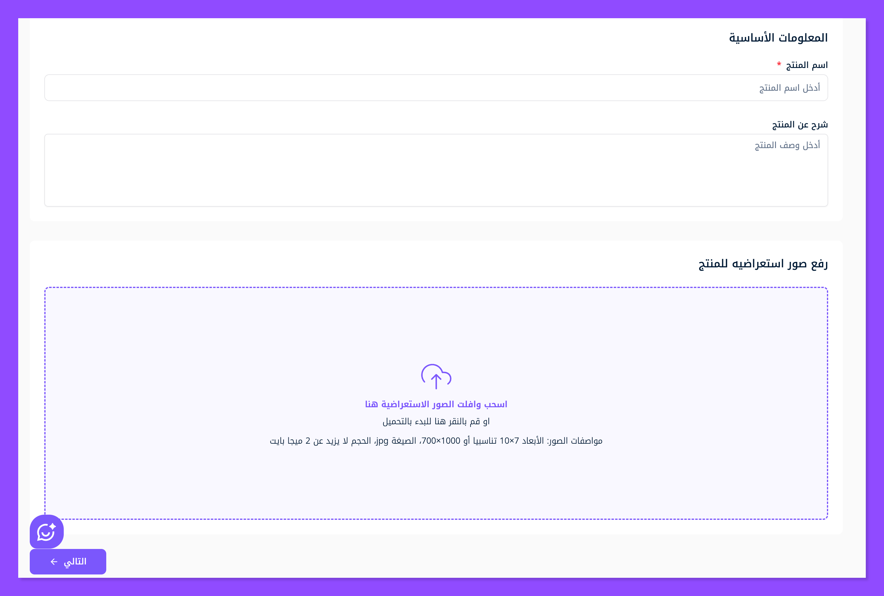 النافذة الأولى، عبئ فيها بيانات أولية مثل اسم المنتج ووصف المنتج وصورة المنتج