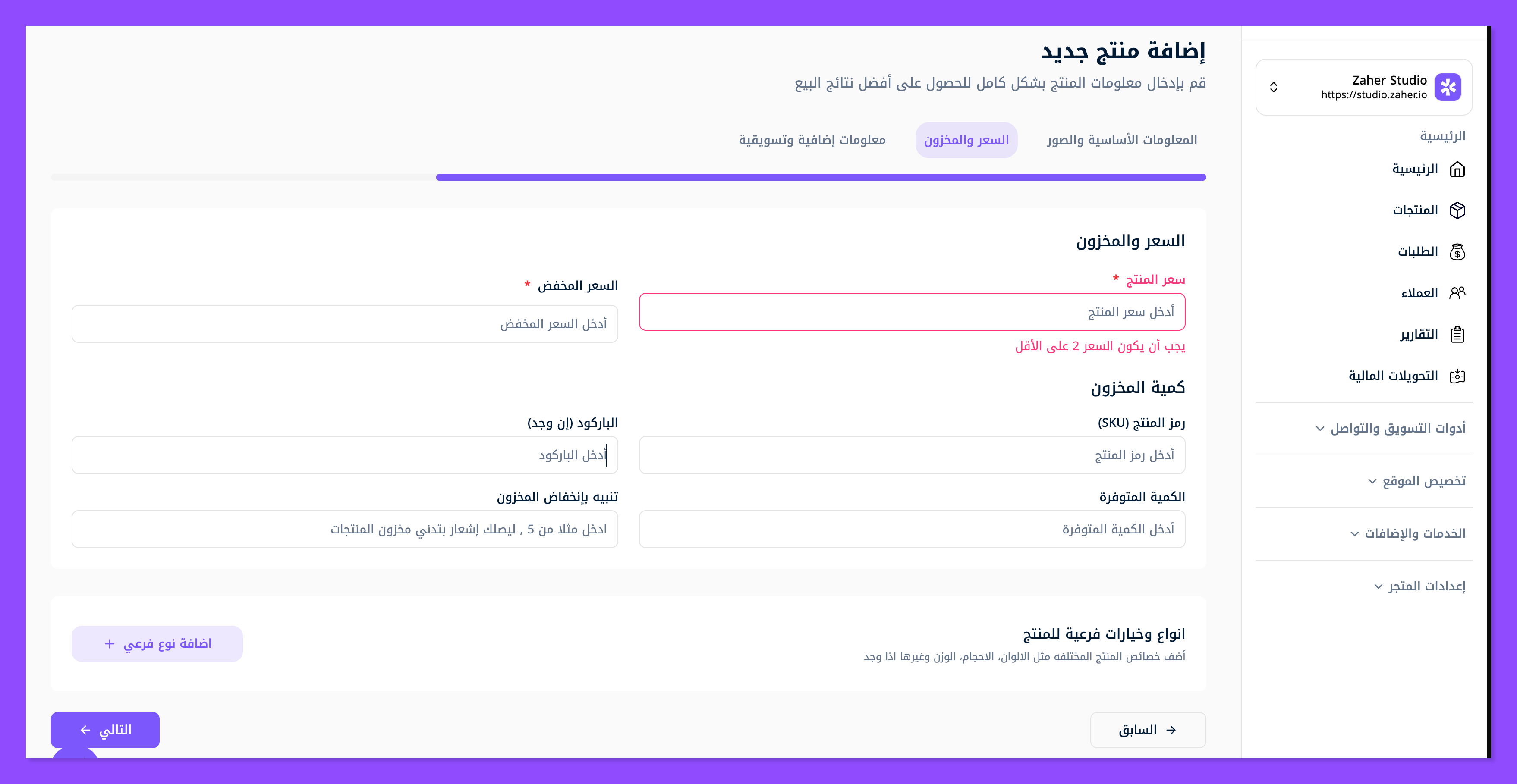 ثم اضغط على التالي لتظهر لك النفاذة الثانية (نافذة السعر والمخزون)، حيث تستطيع تعبئة بيانات مثل سعر المنتج، وإذا كان هناك تخفيضات تستطيع بسهولة وضع السعر المخفض ليظهر للعميل السعر القديم مقابل السعر المخفض الجديد.