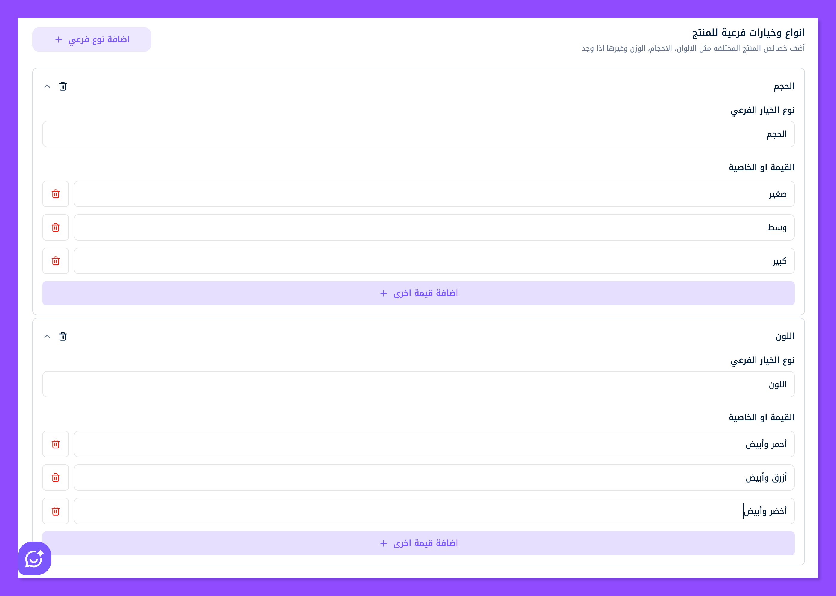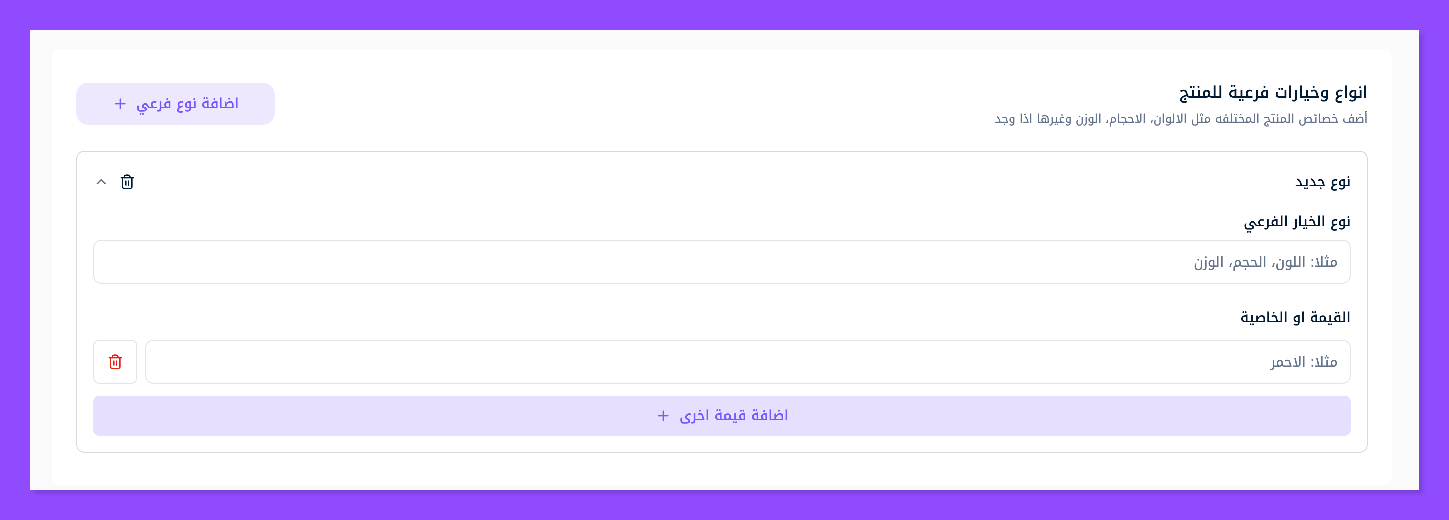 لإضافة خيار فرعي آخر (على سبيل المثال: اللون) اضغط زر إضافة نوع فرعي، ليظهر لك نافذة جديدة تعبئها بخصائص منتجك التالية.
