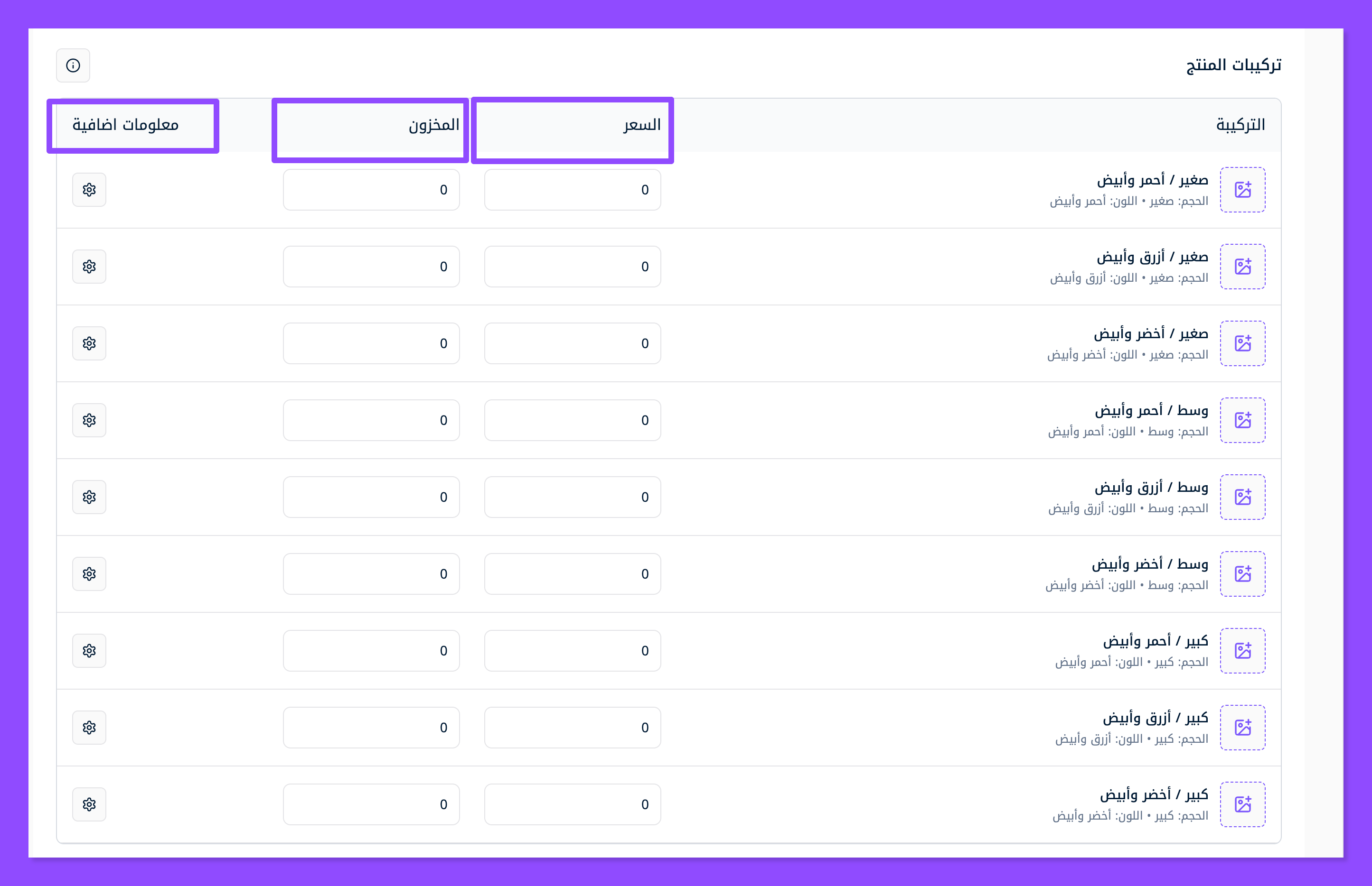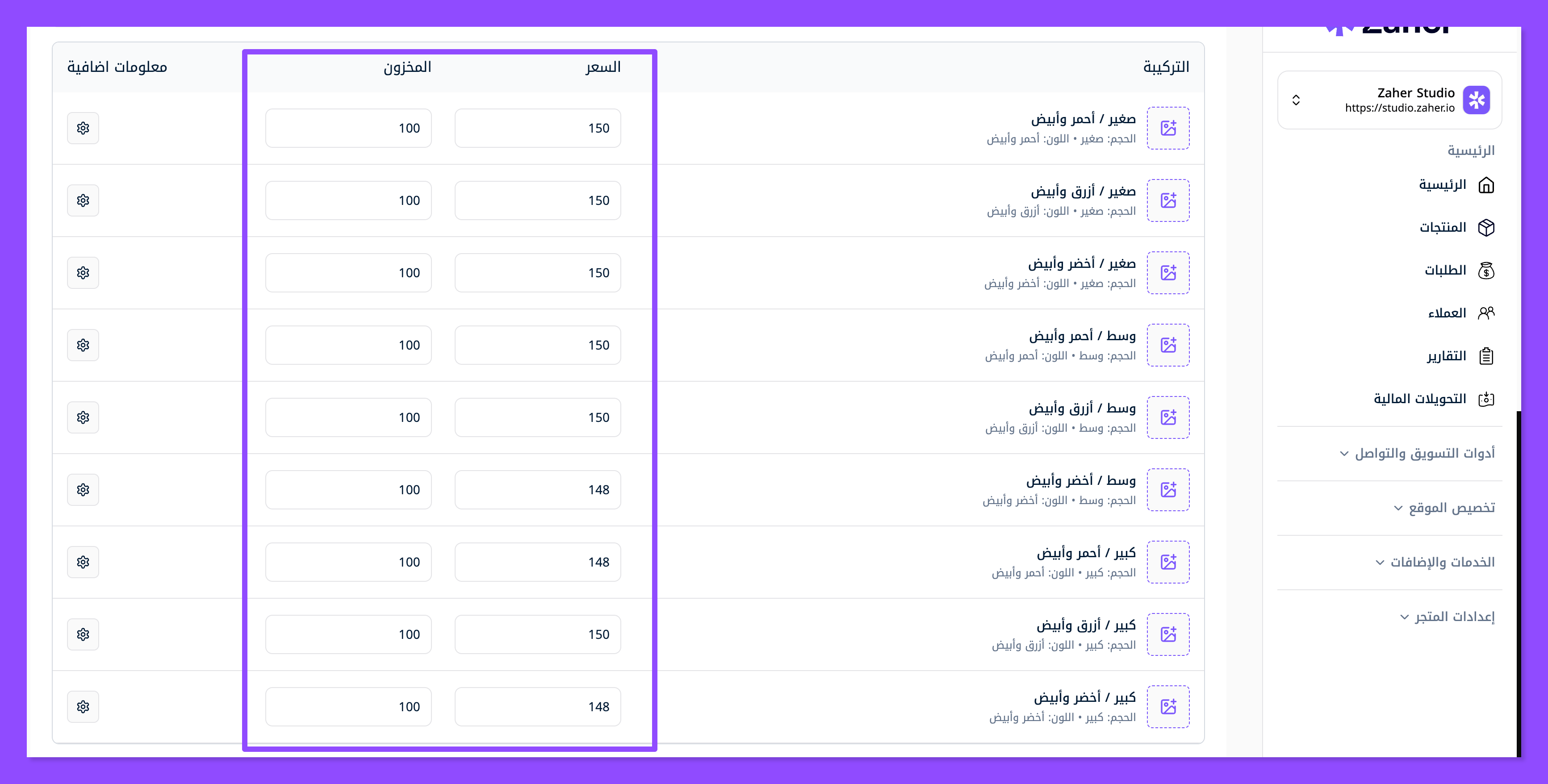 اتجه للأسفل حيث يظهر لك كل منتج بلونه وحجمه المختلف كمنتج مختلف، فابدأ تعبئة السعر وكمية المخزون لديك من هذا المنتج