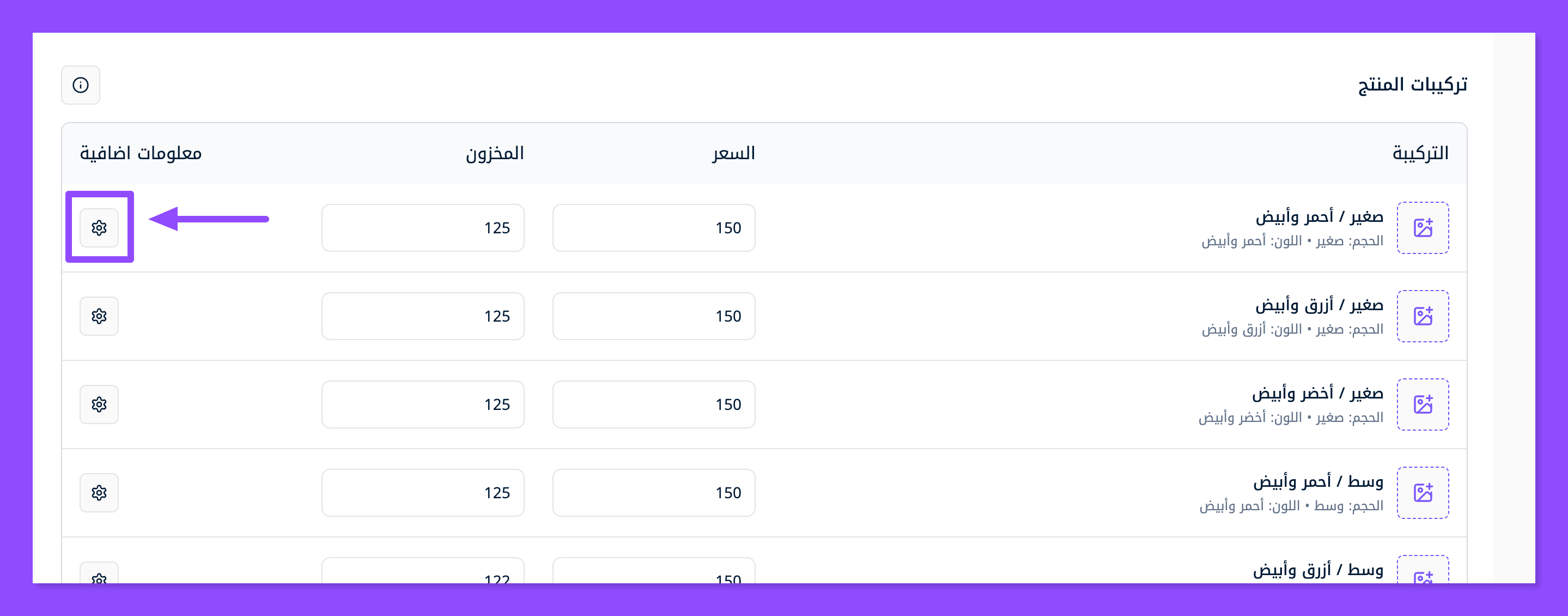 اضغط على أيقونة الترس لأول منتج فرعي للوصول للإعدادات الإضافية التالية وأدخل تفاصيل المنتج الفرعي