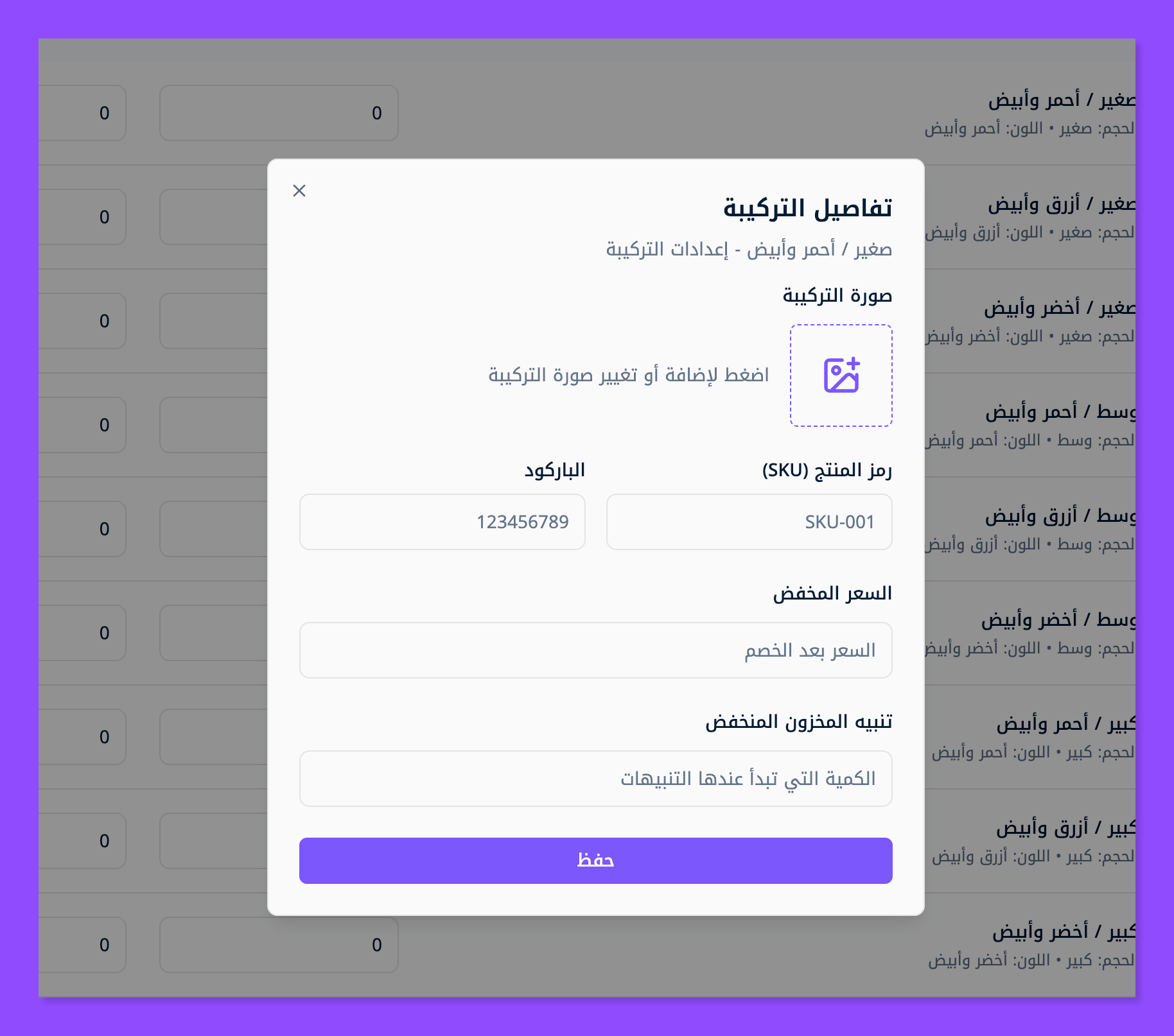 تظهر لك هذه النافذة، وهنا ادخل صورة المنتج الفرعي / ورمز المنتج (sku) / والباركود الخاص بالمنتج / وسعره بعد الخصم / ومتى يظهر التنبيه عند انخفاض مخزون المنتج.
