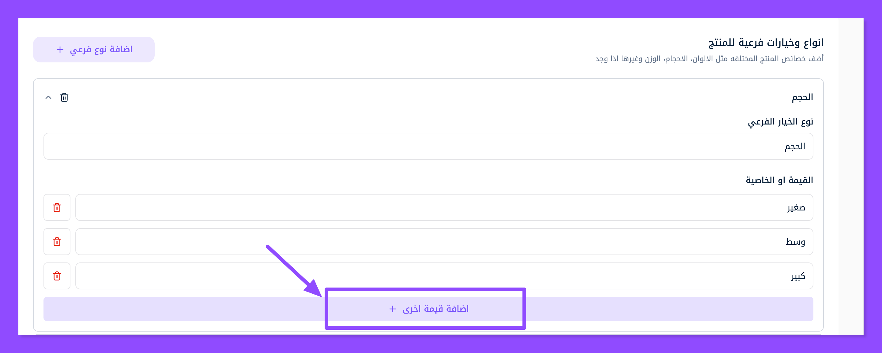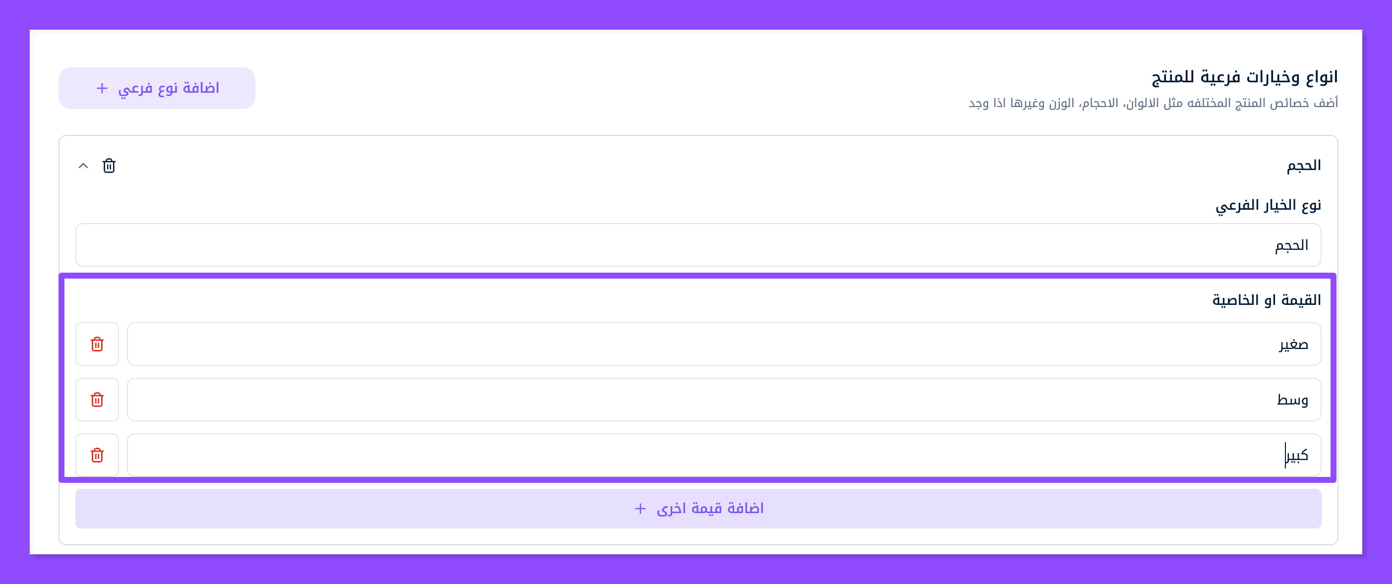 أضف قيم أخرى بالضغط على زر إضافة قيم أخرى وضع عدد الخيارات الذي تريده (صغير، وسط، كبير، كبير جدًا)