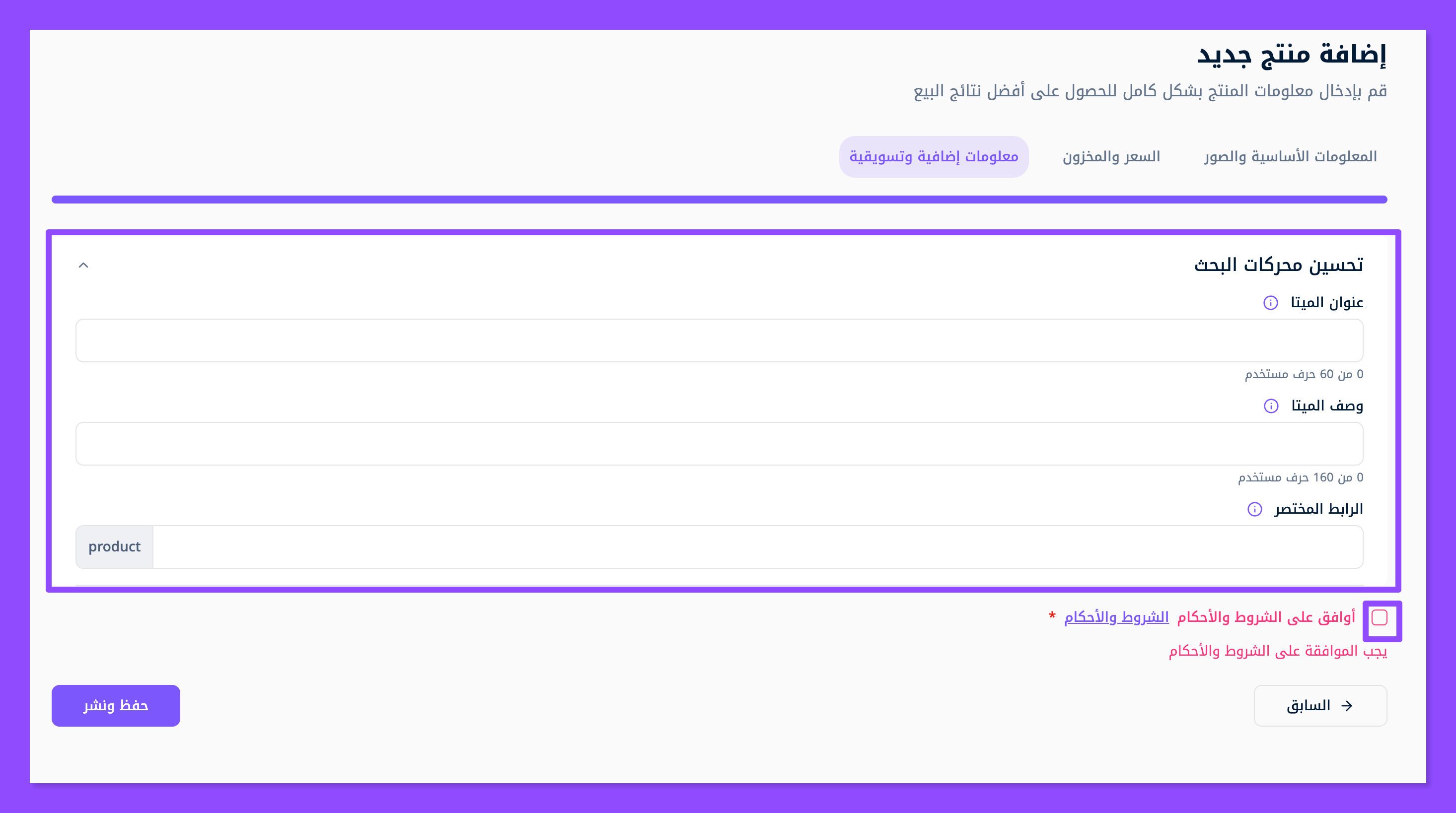 ثم اضغط على التالي ليظهر لك مكان تعبئة بيانات محركات البحث التي ستظهر للعملاء الباحثين عنه في جوجل، مثل عنوان الميتا (meta title) ووصف الميتا (meta description)، والرابط المختصر (url) الذي يجب تعبئته بالللغة الإنجليزية.