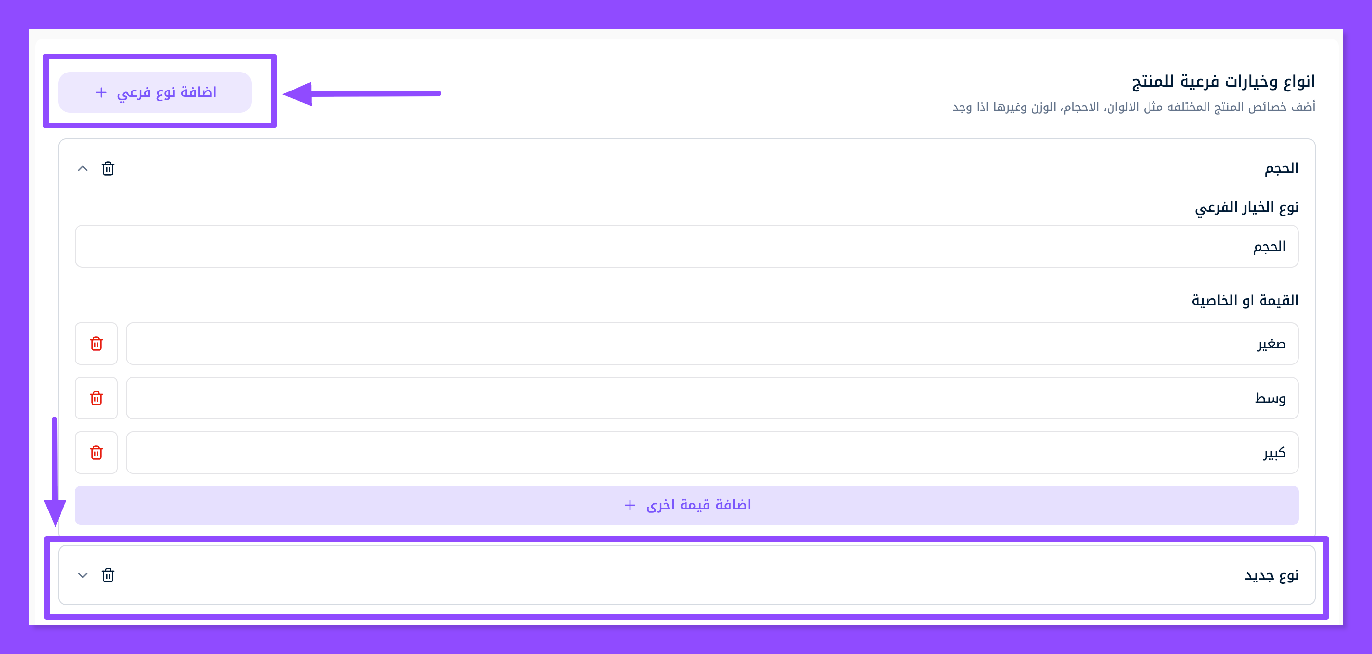 اختر نوع الخيار الفرعي (حجم، وزن، لون، مقاس، نوع، مصدر إلخ)، وهنا اخترت خيار الحجم، ومنه اخترت (صغير، وسط، كبير) تستطيع تسميتها كيفما تريد (S,M,L,XL) أو أي طريقة أخرى
