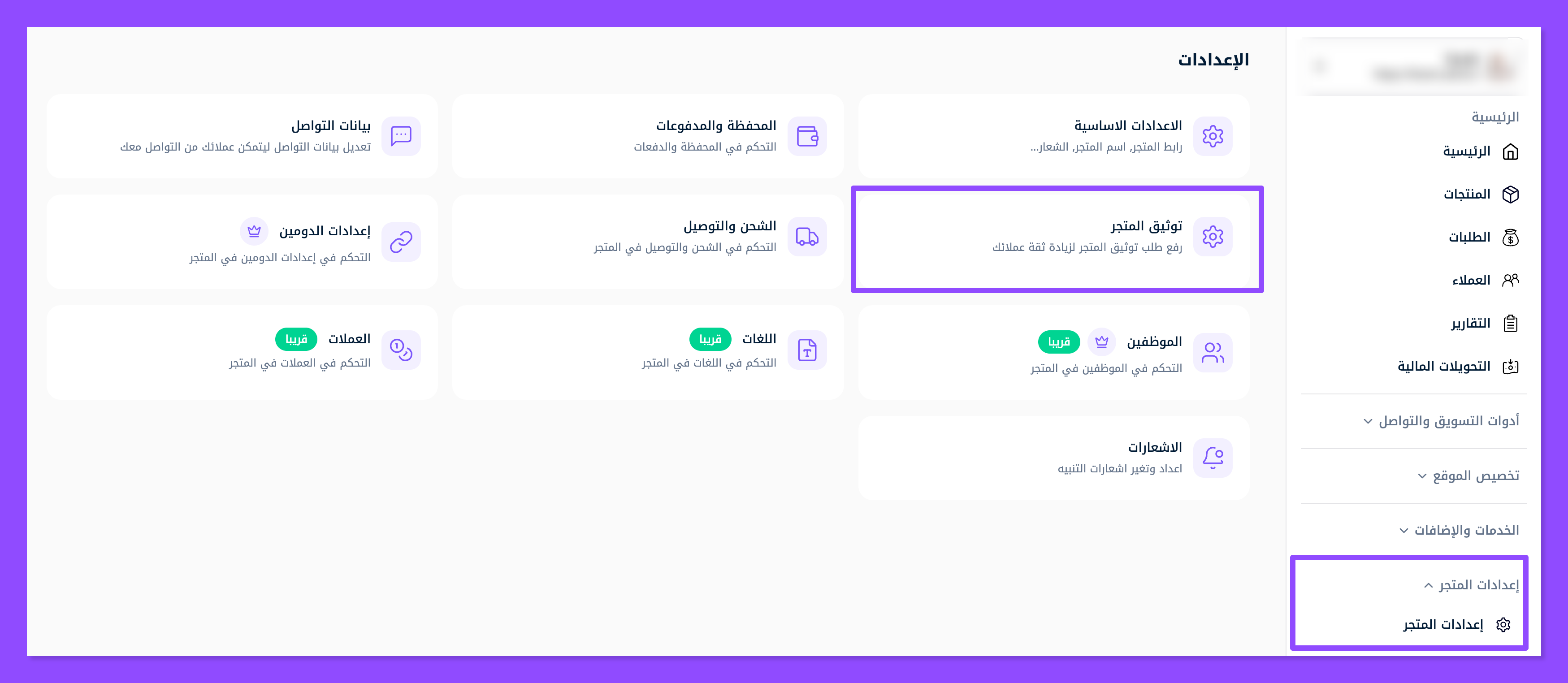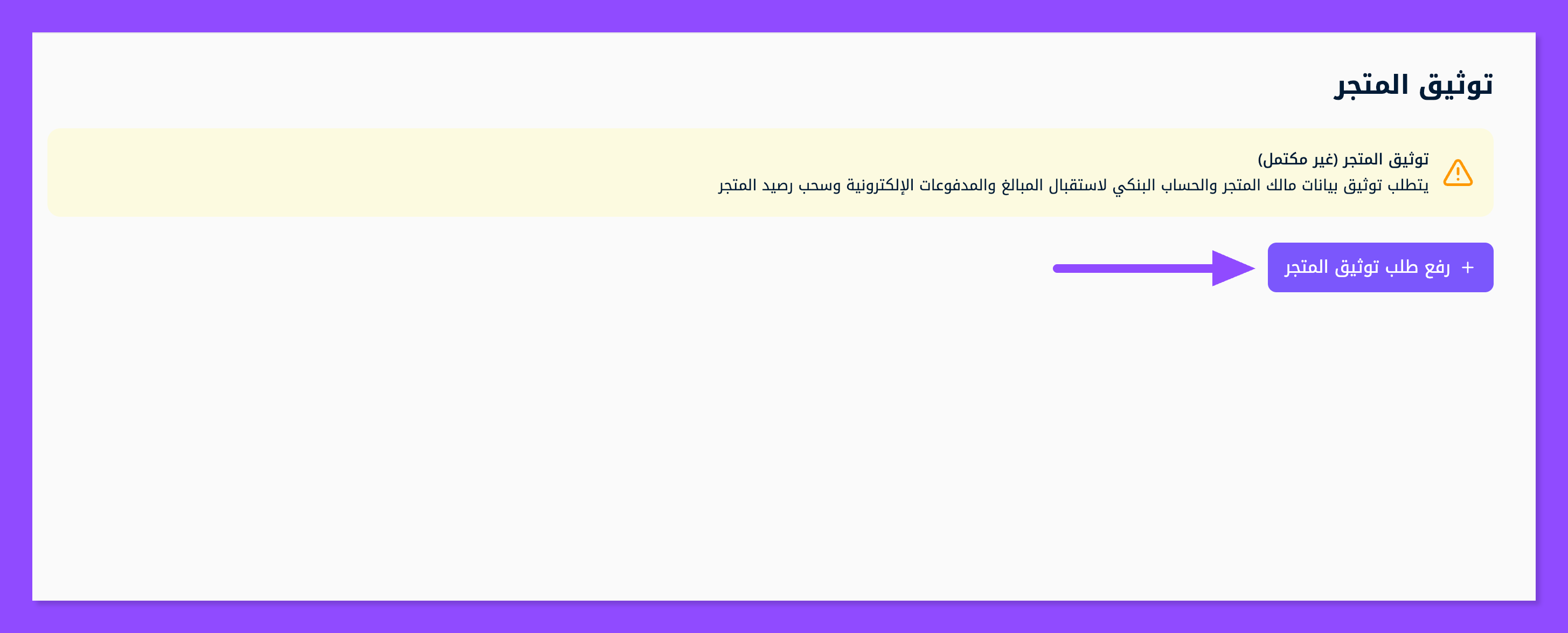 توجه إلى لوحة التحكم في متجرك، ومنها إلى قسم إعدادات المتجر، ومنها إلى قسم توثيق المتجر