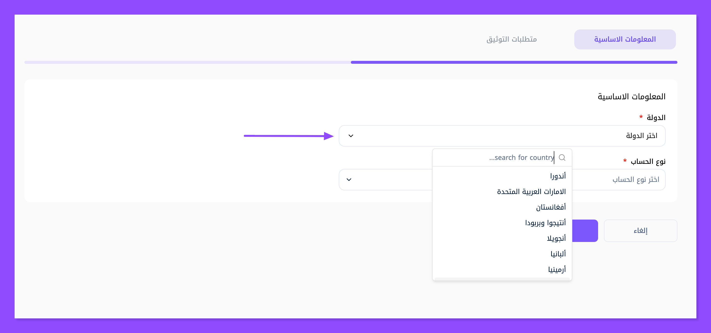 في قسم المعلومات الأساسية، اختار الدولة التي أنت منها.