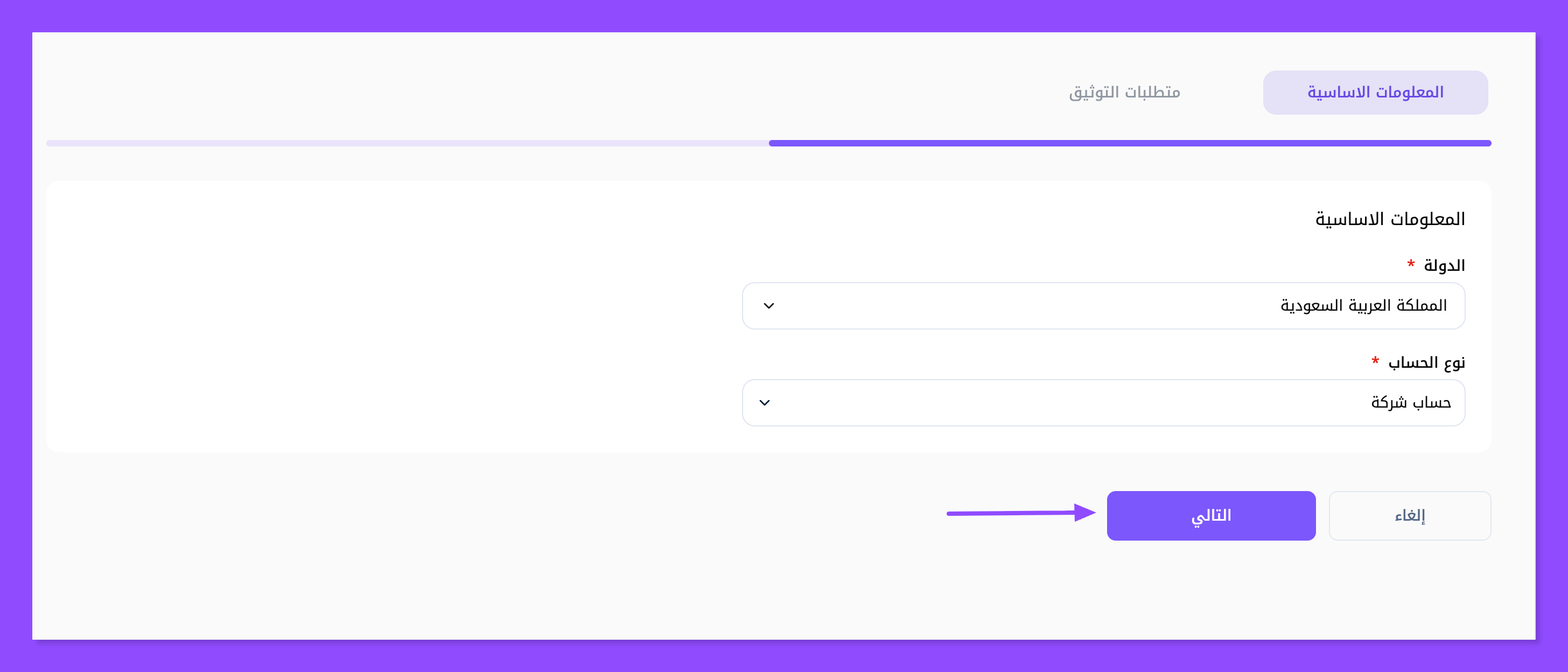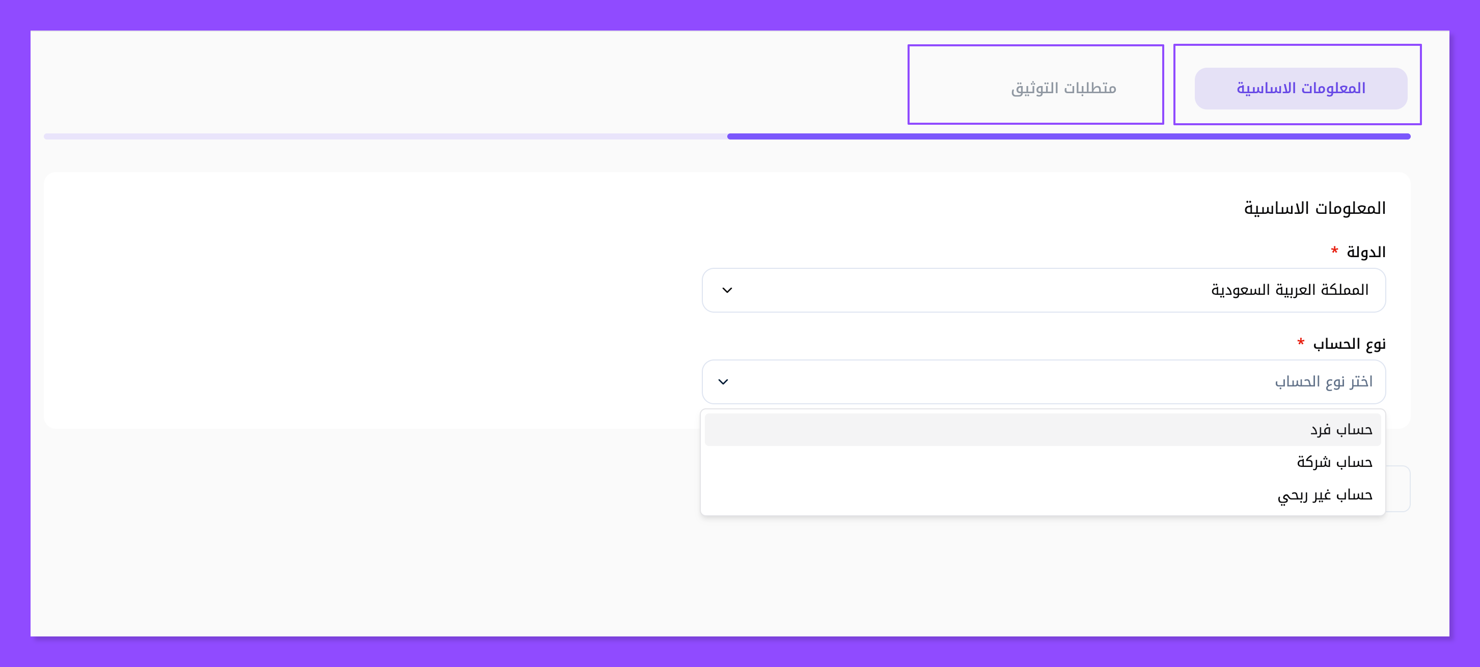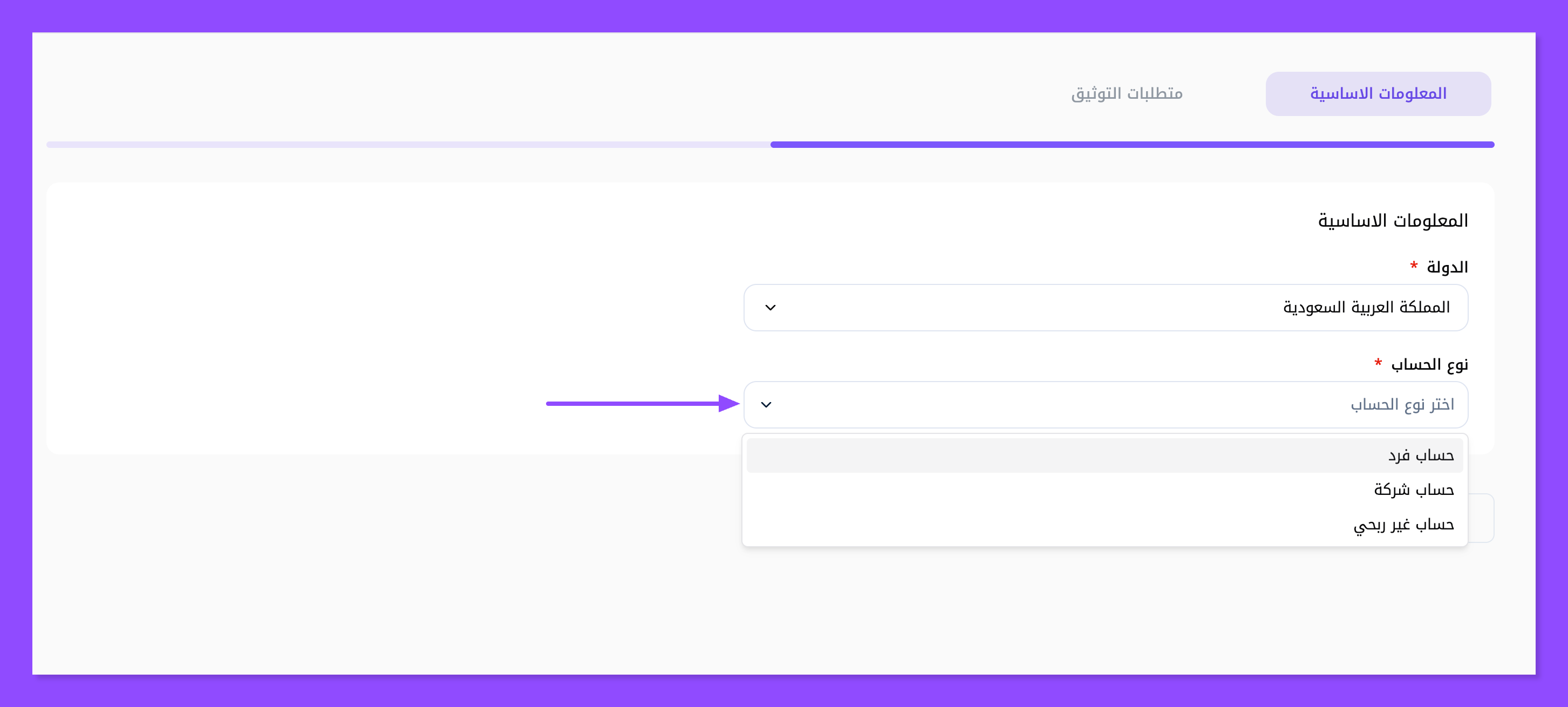 ثم اختار نوع الحساب، إذا كنت فردًا ولا تملك أي سجل تجاري فاضغط على فرد، وإذا كنت شركة لها وجود على أرض الواقع وسجل تجاري فاضغط على حساب شركة، أما إذا كنت تدير مؤسسة أو مشروع غير ربحي فاضغط على حساب غير ربحي.