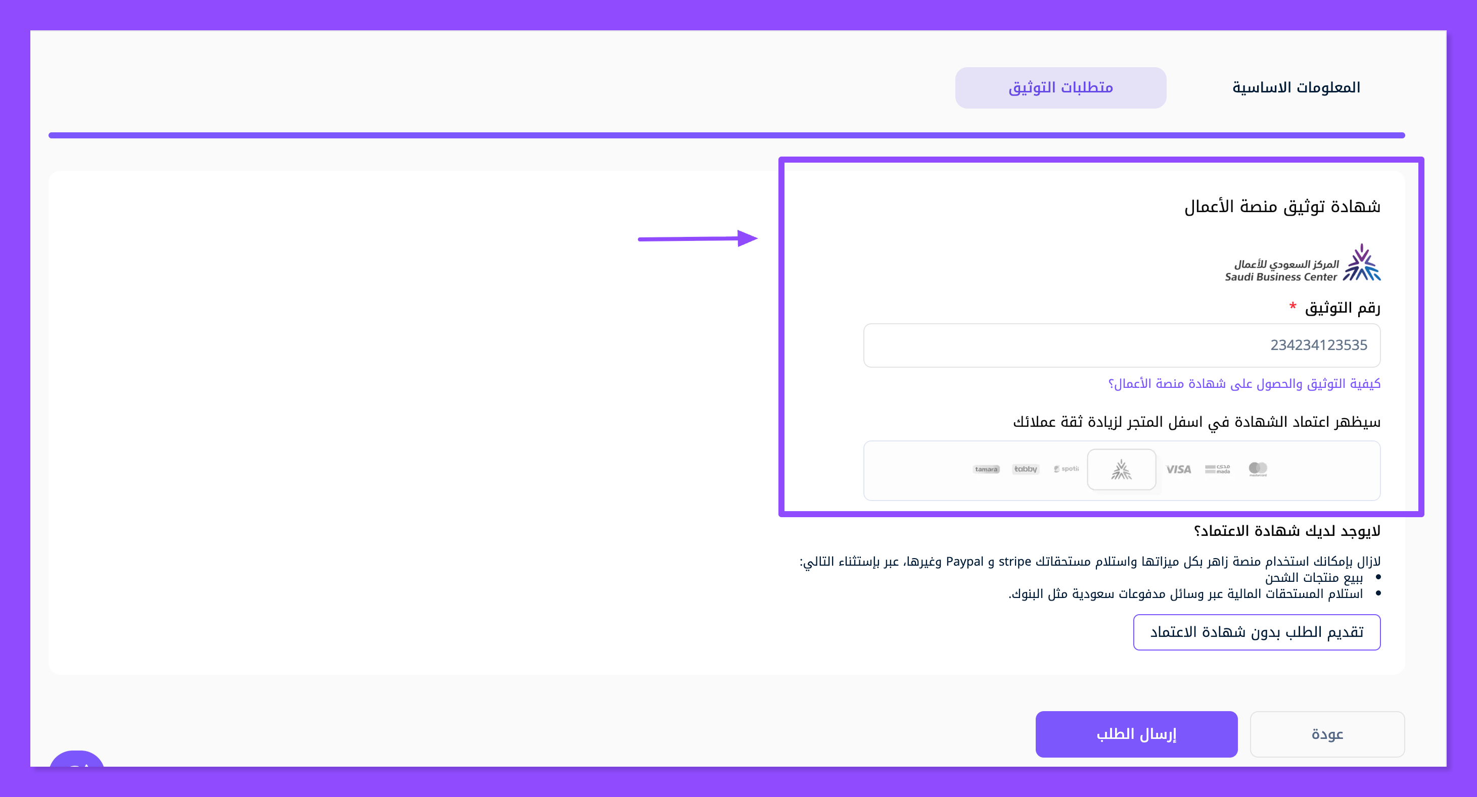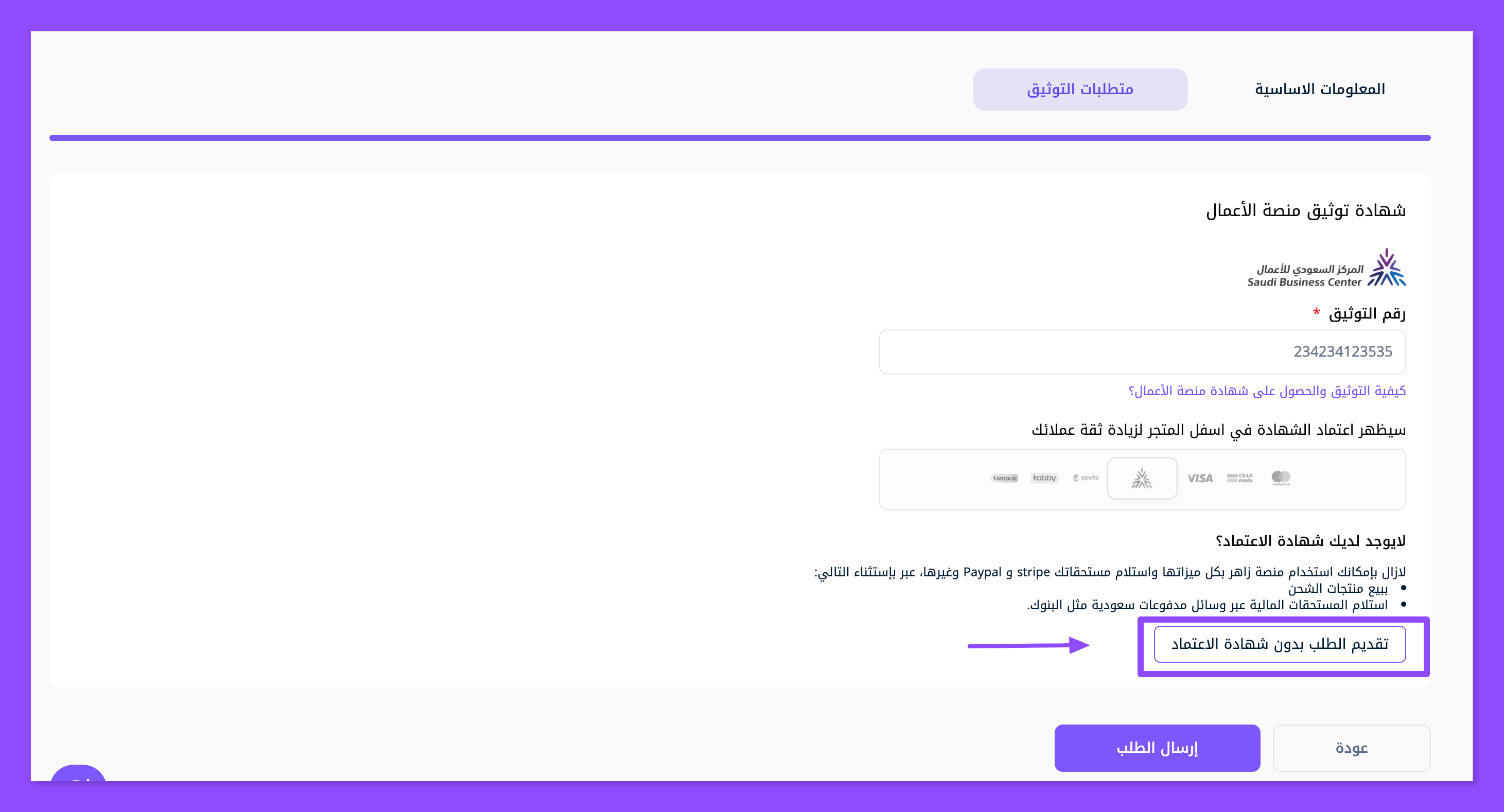 إذا لم يكن لديك شهادة اعتماد، تستطيع تقديم طلب توثيق المتجر بدون شهادة الأعمال، خاصة إذا كنت غير مقيم في السعودية، فاضغط على الزر في الأسفل (تقديم الطلب بدون شهادة اعتماد)