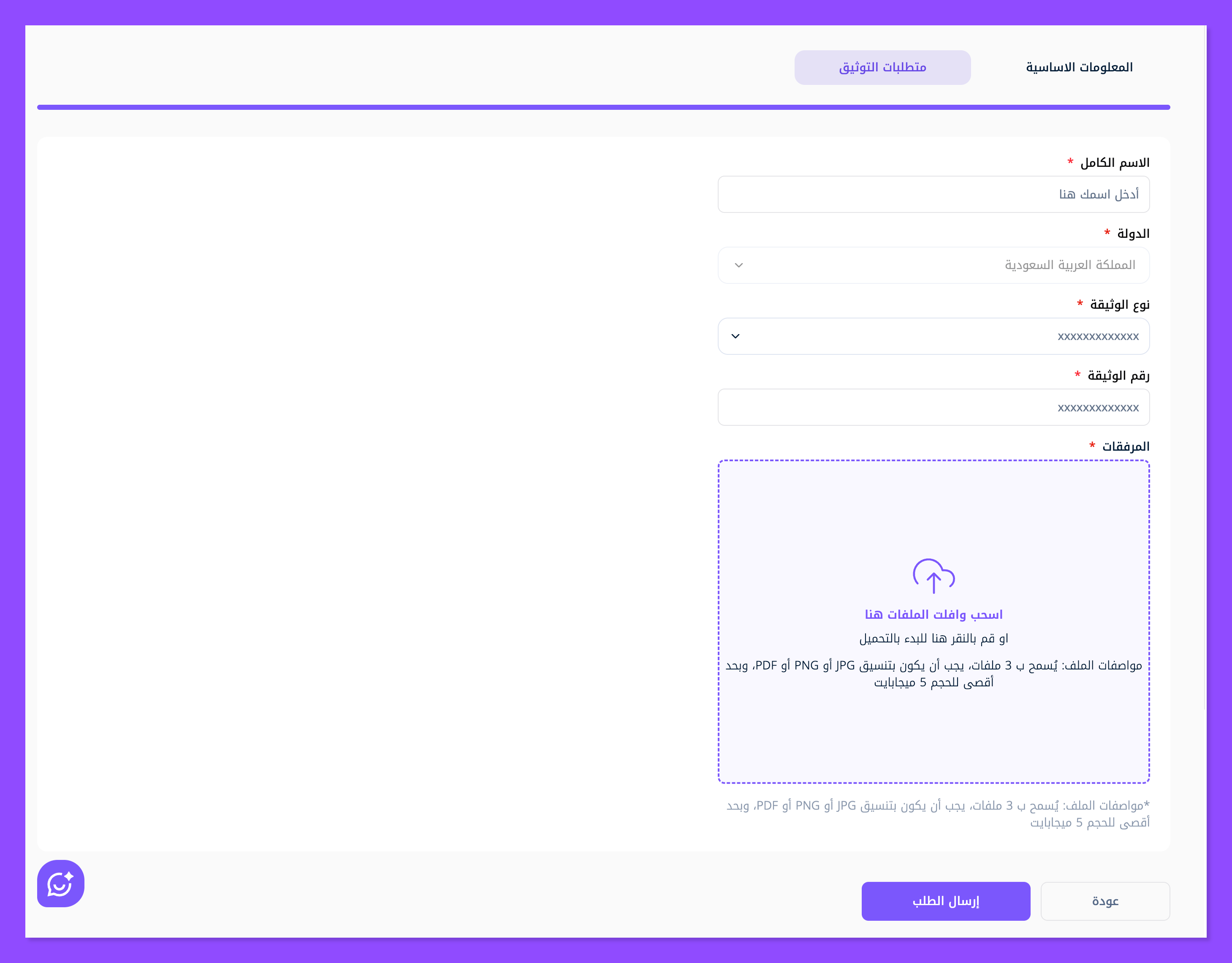 تظهر لك هذه الصفحة، أدخل فيها المعلومات المطلوبة، مثل الاسم الكامل، الدولة، ونوع الوثيقة (جواز سفر، معرف إقامة، هوية شخصية، إلخ) مع رقم الوثيقة وارفع أخيرًا أي مرفقات ضرورية مثل صورة عن جواز السفر أو صورة عن الهوية، واضغط أخيرًا على زر إرسال الطلب