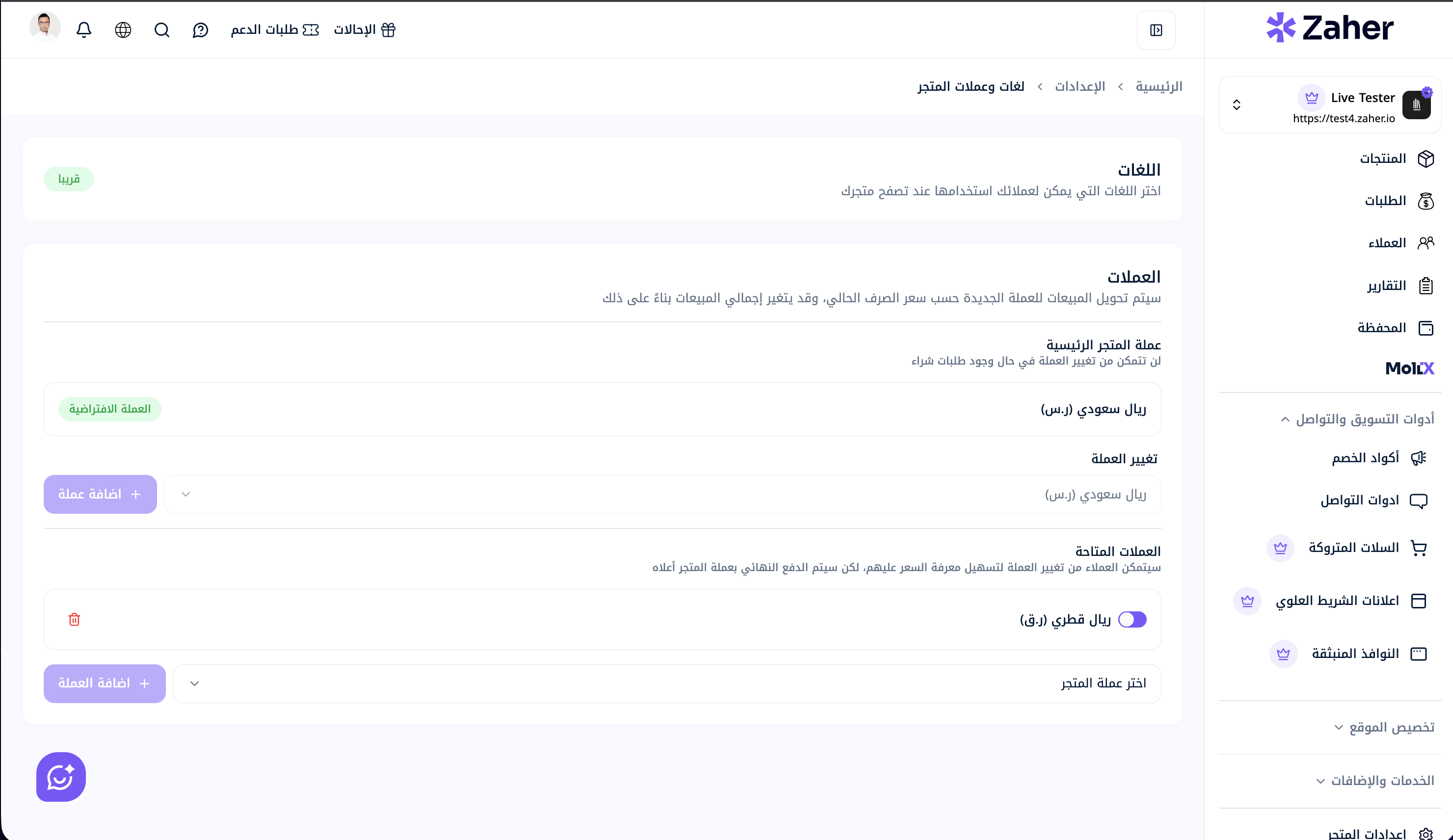زاهر يتيح لك الآن التحكم الكامل في عملة متجرك — تحدد العملة الرئيسية التي تُسعَّر بها منتجاتك وتُحتسب بها المبيعات، وتضيف عملات إضافية تظهر لعملائك لمساعدتهم على معرفة السعر بعملتهم المحلية. الدفع النهائي يتم دائماً بعملة المتجر الرئيسية.