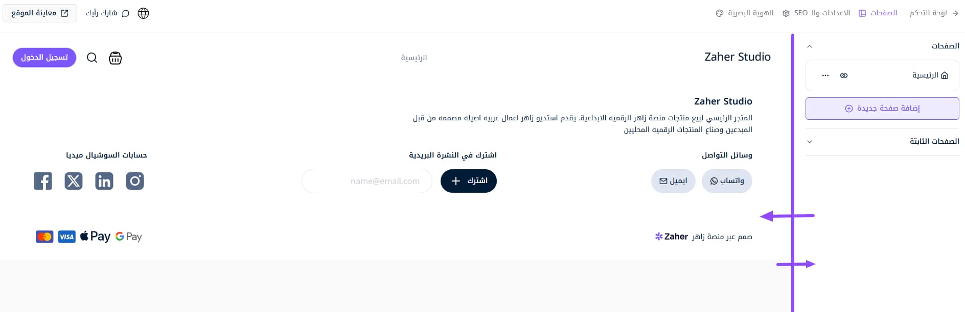 5- من جهة اليمين، تستطيع إضافة صفحات جديدة، (مع العلم بأن أول صفحة تضيفها هي الصفحة الرئيسية الأولى التي تظهر بمجرد الدخول إلى دومين متجرك عبر الإنترنت) - بغض النظر عن اسمها، ومن هنا تستطيع إضافة عدة صفحات جديدة وربطهما معًا مع الهيدر والفوتر بكل سهولة.