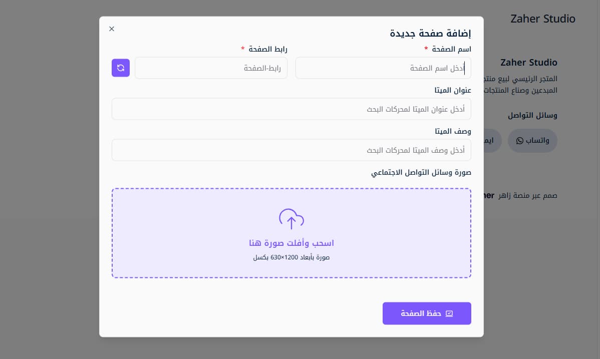 رابط الصفحة: لن تستطيع تغييره أو التحكم فيه في الصفحة الرئيسية لأن الدخول إلى هذه الصفحة سيكون بالرابط الأساسي لمتجرك yourstorename.zaher.io.