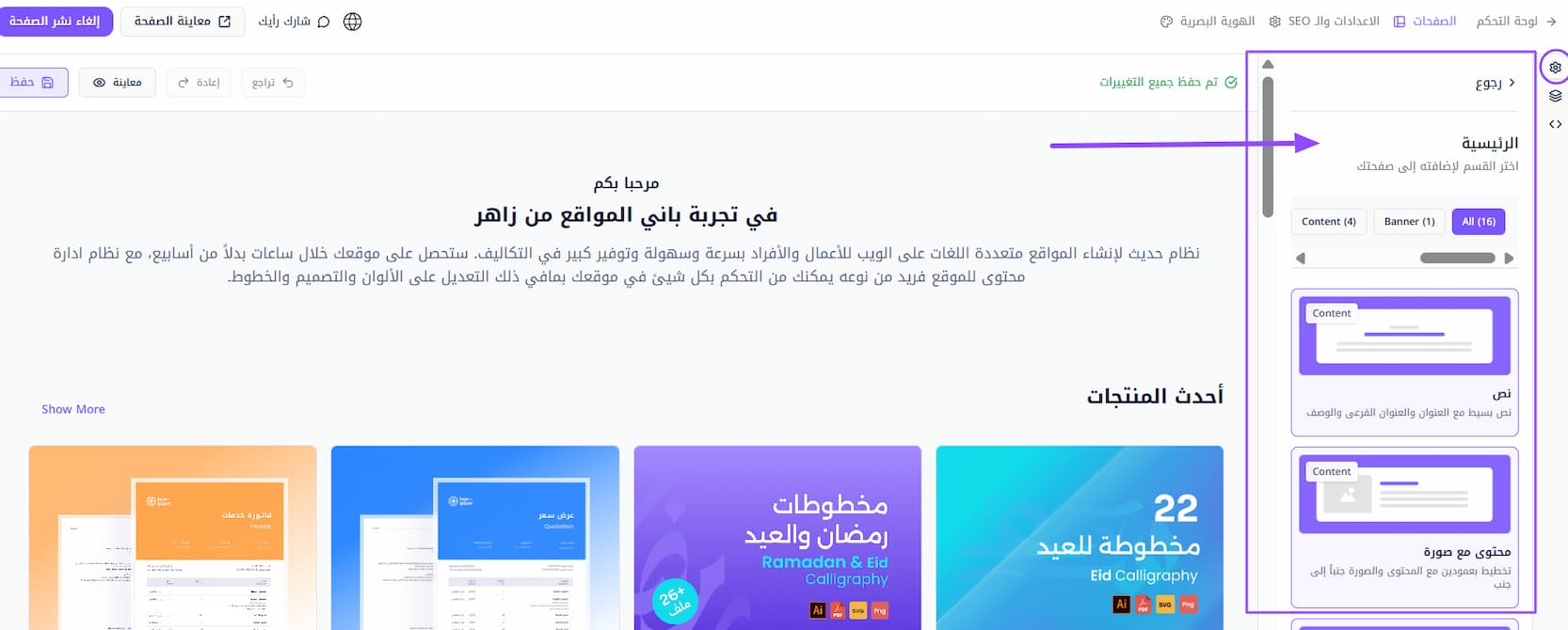 بعد إنشاء الصفحة الرئيسية وتعبئة بيانات الصفحة جميعها، هنا تستطيع تعديل الصفحة من الداخل عبر خاصية السحب والإفلات من أكثر من 16 قسم جاهز للاستخدام، ضع الأقسام التي تريدها والمحتوى الذي تريده واضغط على زر حفظ يسار الشاشة من الأعلى.