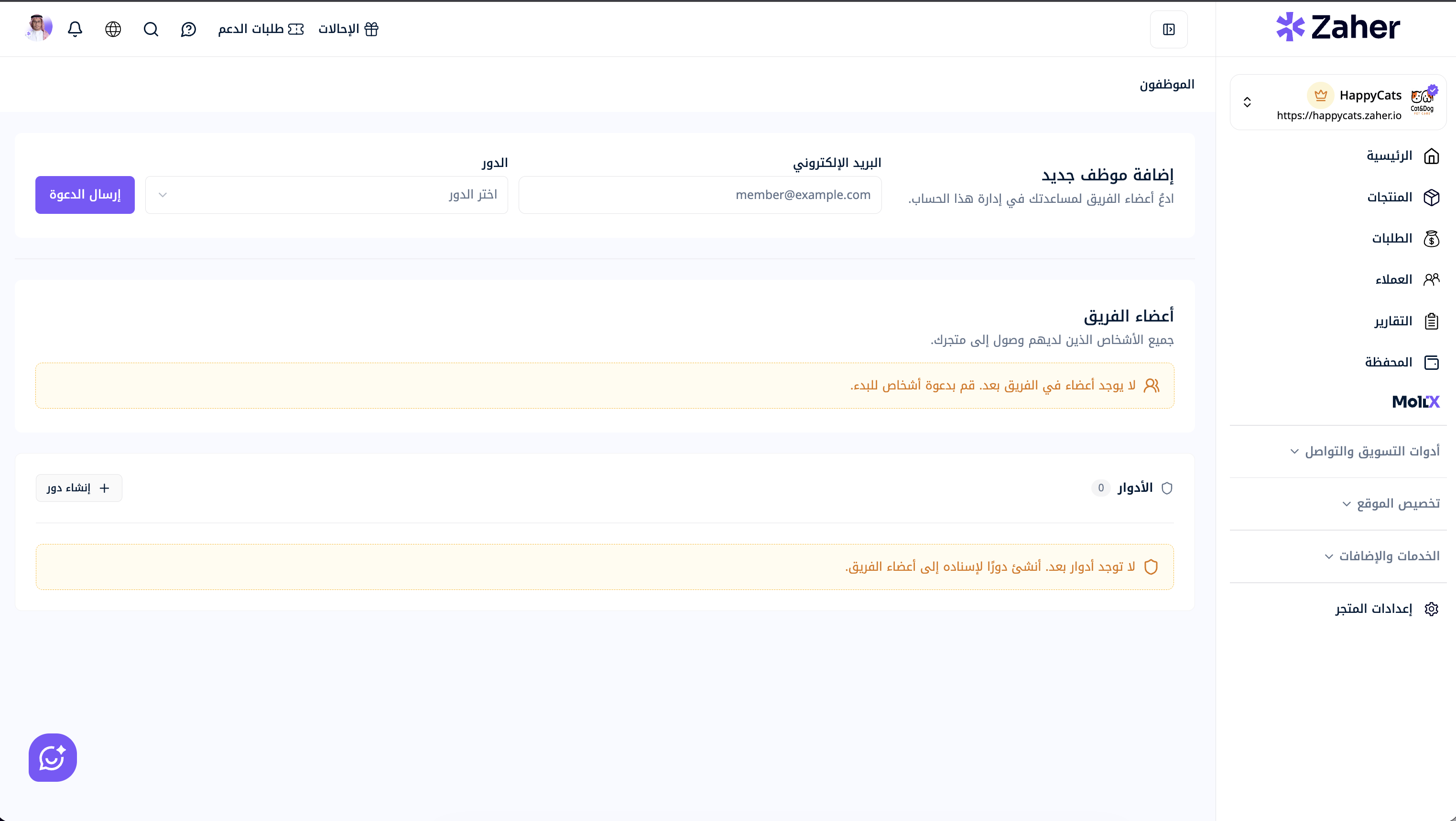 إذا كان متجرك يديره أكثر من شخص، فلا يجب أن يدخلوا جميعاً بحساب واحد. ميزة الموظفين تتيح لك دعوة أعضاء الفريق وتحديد صلاحيات كل شخص بدقة عبر نظام أدوار قابل للتخصيص الكامل — حتى ١٠٦ صلاحية موزعة على جميع أقسام المتجر.