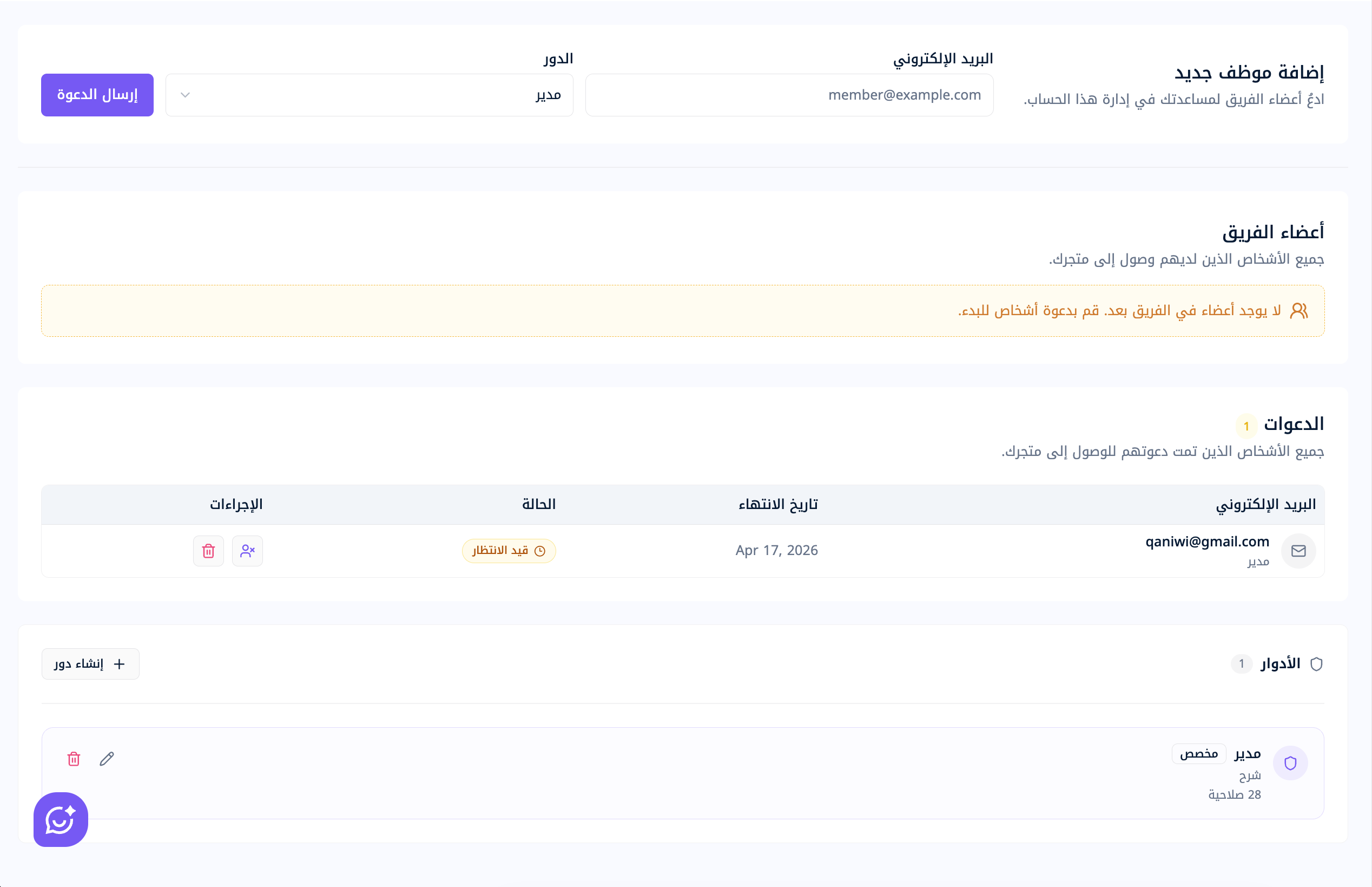 بعد قبول الدعوة، يظهر الموظف في قسم أعضاء الفريق. يمكنك من هنا مراجعة أدوارهم وتعديل صلاحياتهم في أي وقت.