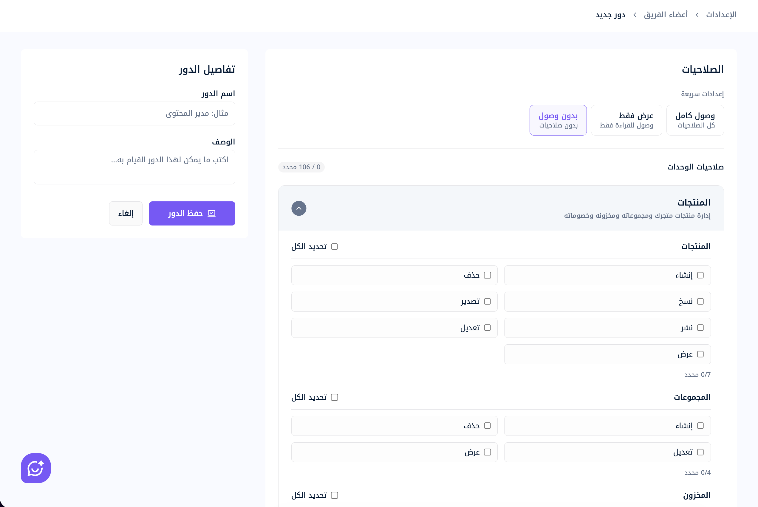 أو تختار يدوياً من صلاحيات الوحدات — ١٠٦ صلاحية مقسّمة حسب القسم. مثلاً قسم المنتجات يتيح لك تحديد: إنشاء، حذف، تصدير، نسخ، نشر، تعديل، عرض — كل إجراء مستقل بمفرده. وهكذا لجميع أقسام المتجر كالمجموعات والطلبات والعملاء والتقارير وغيرها.